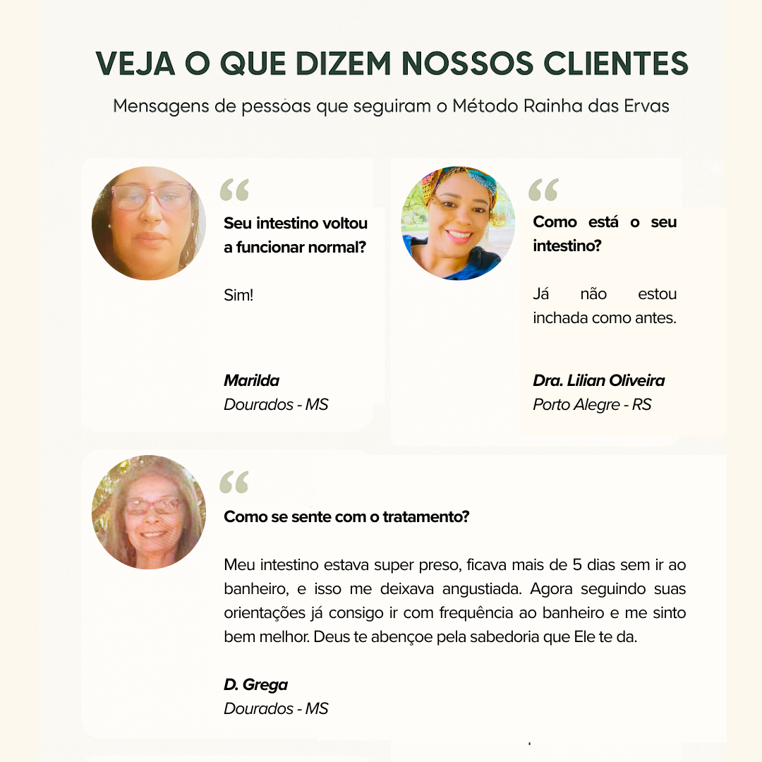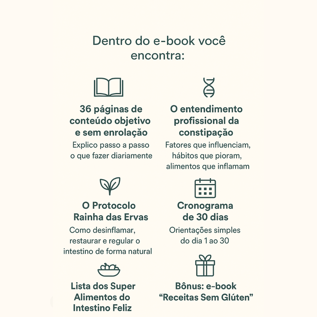 O Método Rainha das Ervas vai destravar o seu intestino e reverter de forma 100% natural, prática, leve e sem segredos a constipação e intestino preso em 30 dias. Além disso, vai trazer muitos benefícios, como: