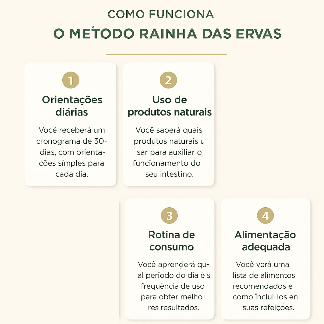 Fique tranquilo(a) o Método Rainha das Ervas foi desenvolvido de forma simples e prática. Por isso, fizemos um cronograma que vai te auxiliar durante os 30 dias, é só você seguir certinho. Conforme você vai vendo os resultados positivos no funcionamento do seu intestino, você vai se animando e sua força de vontade vai aumentar.